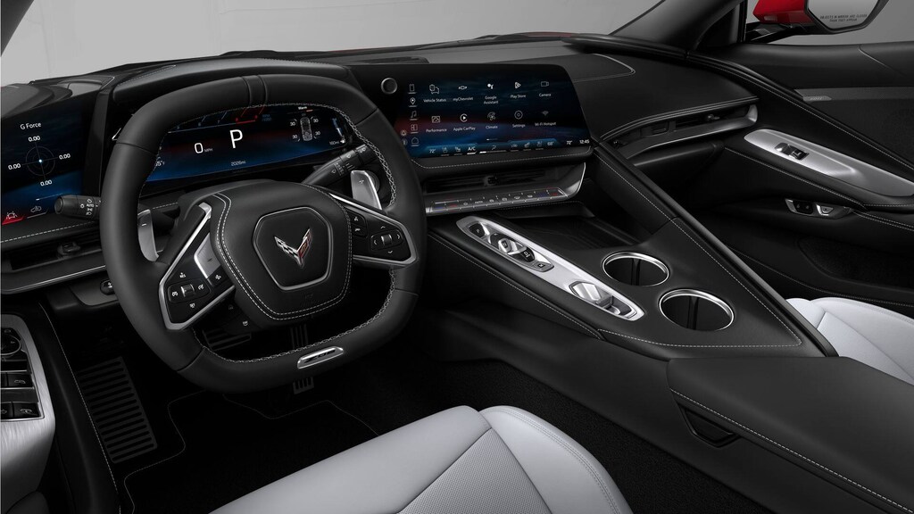 10 Speakers, 4-Wheel Disc Brakes, 8-Way Power Driver Seat Adjuster, 8-Way Power Passenger Seat Adjuster, ABS brakes, Adaptive suspension, Air Conditioning, Alloy wheels, AM/FM radio: SiriusXM, Auto High-beam Headlights, Auto-dimming Rear-View mirror, Automatic temperature control, Brake assist, Bumpers: body-color, Compass, Convertible HardTop, Convertible roof lining, Delay-off headlights, Driver door bin, Driver vanity mirror, Dual front impact airbags, Dual front side impact airbags, Electronic Stability Control, Emergency communication system: OnStar and Chevrolet connected services capable, Four wheel independent suspension, Front anti-roll bar, Front Bucket Seats, Front Center Armrest, Front dual zone A/C, Front reading lights, Fully automatic headlights, Glass rear window, GT1 Bucket Seats, Heads-Up Display, Heated door mirrors, Illuminated entry, Integrated roll-over protection, Leather Shift Knob, Leather steering wheel, Low tire pressure warning, Mulan Leather Seating Surfaces with Perforated Inserts, Navigation System, Occupant sensing airbag, Outside temperature display, Overhead console, Panic alarm, Passenger door bin, Passenger vanity mirror, Power convertible roof, Power door mirrors, Power driver seat, Power passenger seat, Power steering, Power windows, Premium audio system: Chevrolet Infotainment 3 Plus, Radio data system, Radio: Infotainment System with Google Built-in, Rear anti-roll bar, Rear window defroster, Remote keyless entry, Speed control, Speed-sensing steering, Spoiler, Sport steering wheel, Steering wheel mounted audio controls, Tachometer, Telescoping steering wheel, Tilt steering wheel, Traction control, Trip computer, Turn signal indicator mirrors, Variably intermittent wipers, Voltmeter, Wheels: 20 x 10 Front and 21 x 13 Rear Titanium Satin.